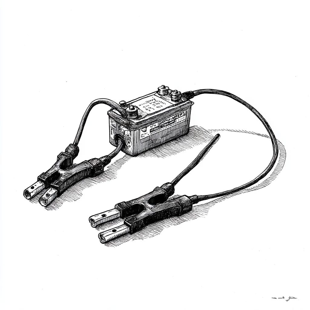 This is what I think the artisan does. Not “rescue”, or change management. Not the dramatic intervention of the jump start, which shocks the system into temporary life but leaves it fragile. The artisan is the one or two per cent; the person who, through their own practice, presence, and their own willingness to sit with the flat battery and find the connection, provides just enough charge for the trickle charger to take over.